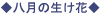 太陽をいっぱいに浴びて顔を出すパンパスグラス。その直線的な姿を紺碧の空に仰ぎ見る時、何とはなしに秋の気配が感じられます。向日葵、トルコ桔梗、カスピア、ニューサイランを取り合わせて立秋の花とします。 |